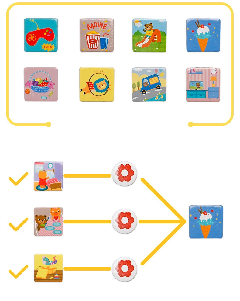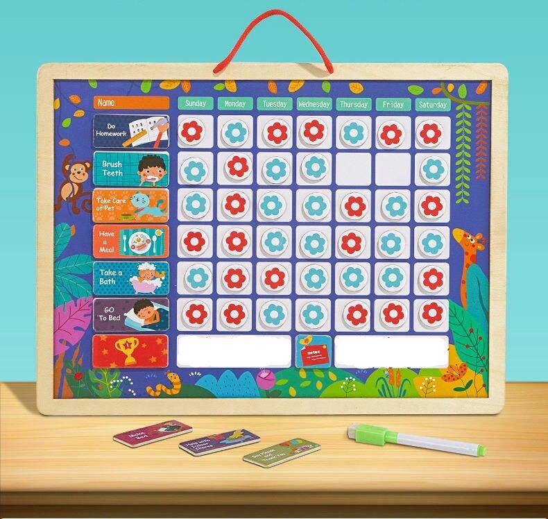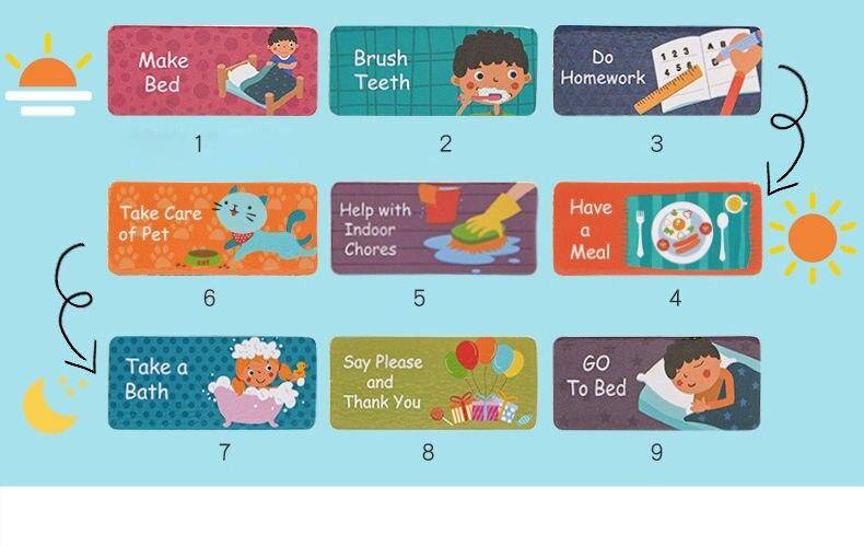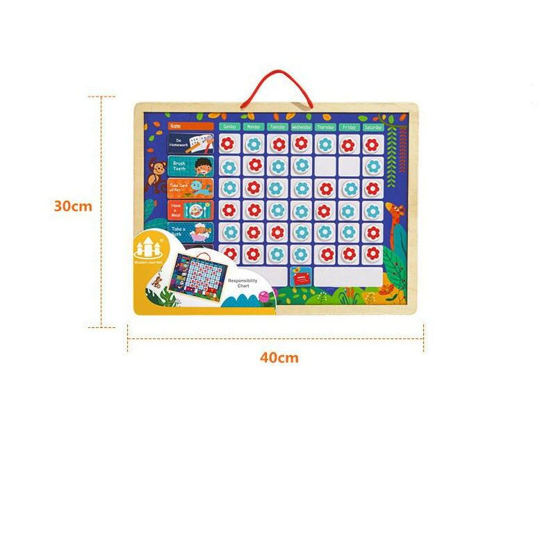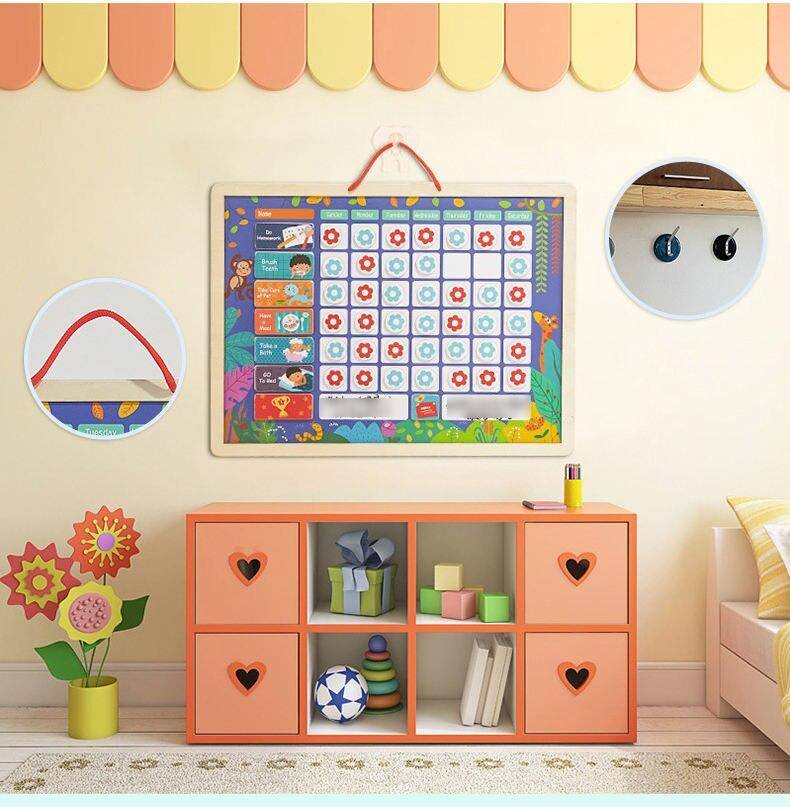 The Kid’s Montessori Time and Task Management Educational Board will help you and your child manage household duties in a fun and educational way.  It will help develop routines that your child will follow.  Your little ones will no longer have to guess when it is time to brush their teeth or go to bed!